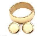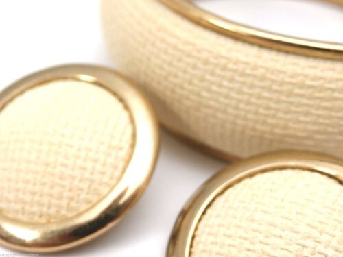 Vintage Sarah Coventry jewelry set- " Mademoiselle" Cuff style bangle bracelet. The ivory plastic looks and feels like linen. It measures approximately 2 3/8" across, 7/8" in width, and the earrings are little over 1". Excellent condition!