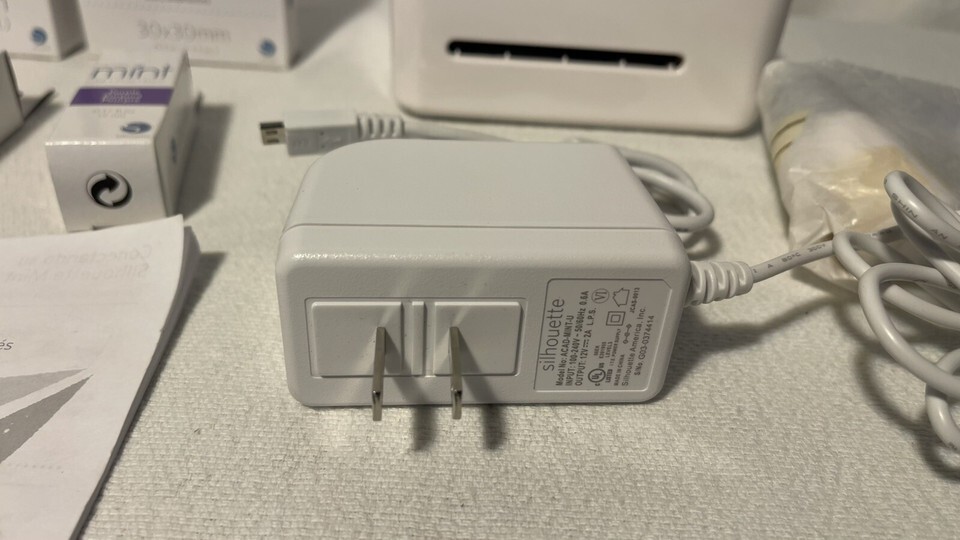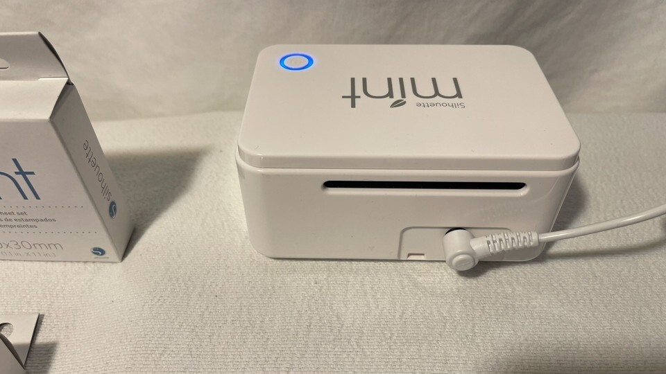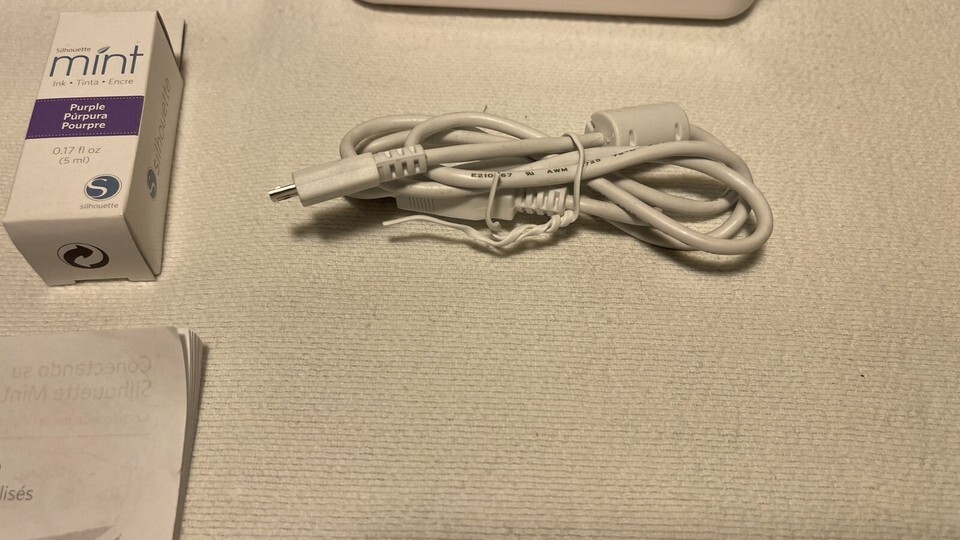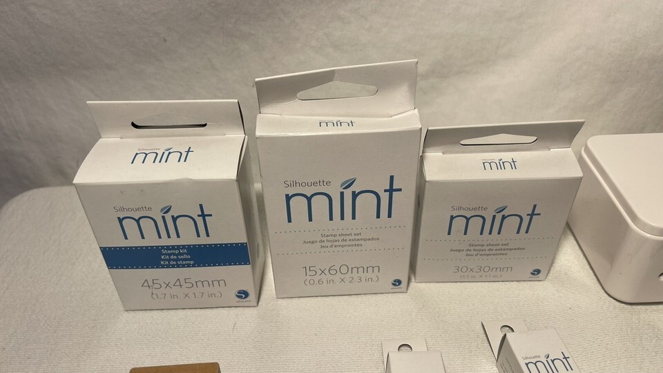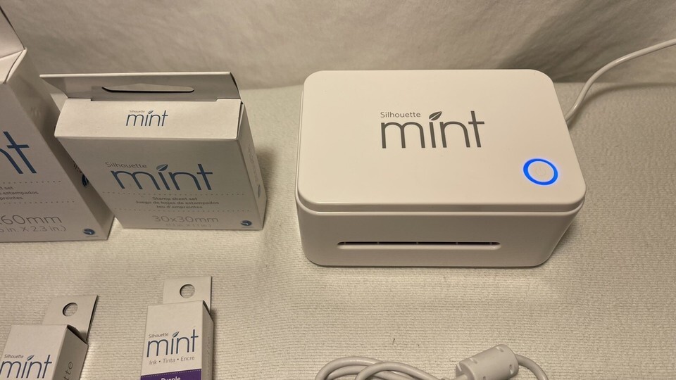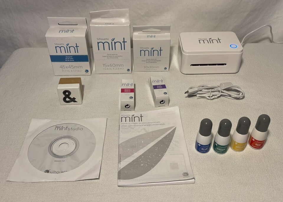 Silhouette Mint Custom Stamp Maker. Cables, Book, CD, Various Size Stamp Kits. Condition is Used. Shipped with UPS Ground.