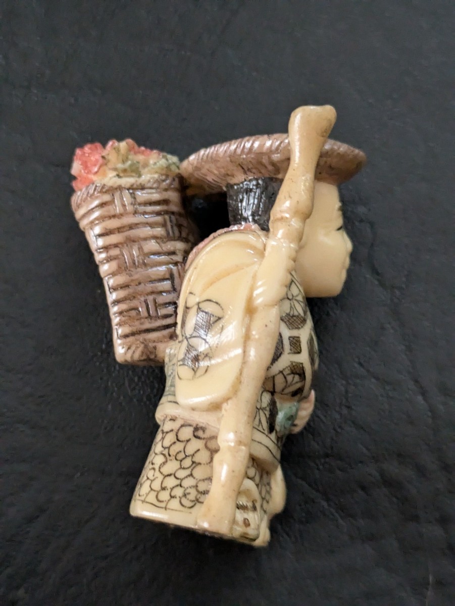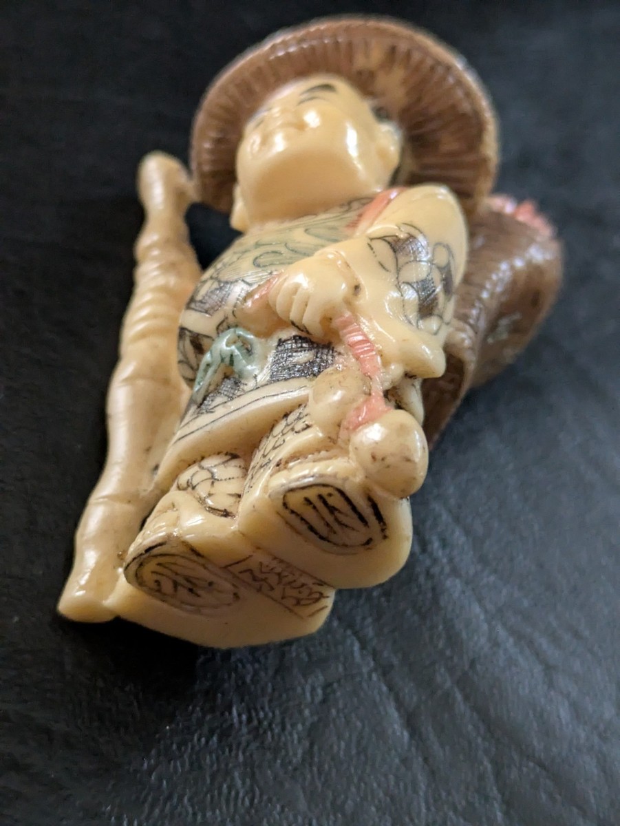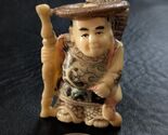 - Stehend Mann Gehstock Korb Casa Hut Netsuke Japanische Bemalt Geschnitzte Harz
