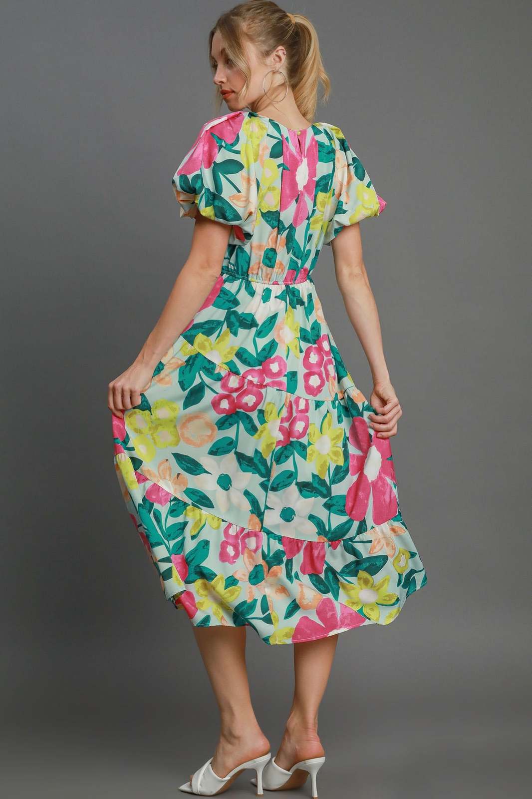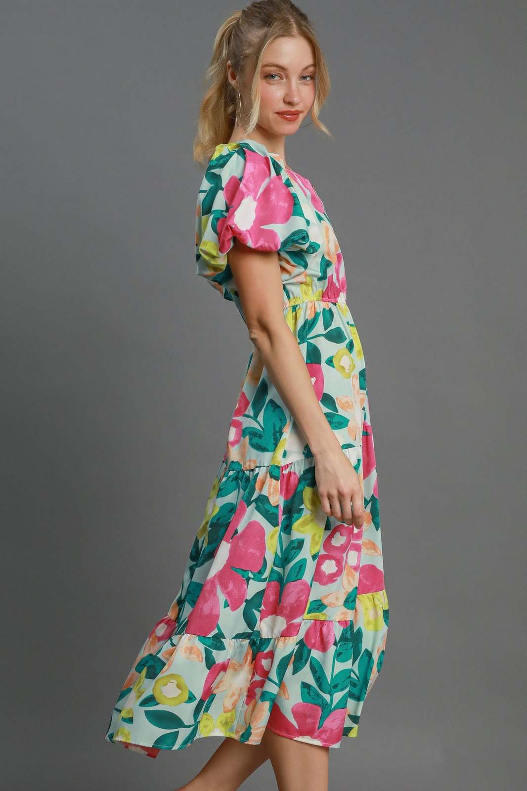 - Umgee Full Size Tiered Floral Print Notched Puff Sleeve Midi Dress Plus Size