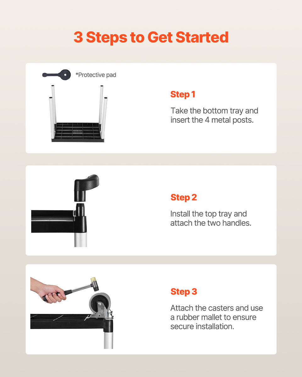 Quick Assembly: With clear instructions, assembling this rolling utility cart is quick and easy, making it great for use in the garage, office, or home to organize and transport items.