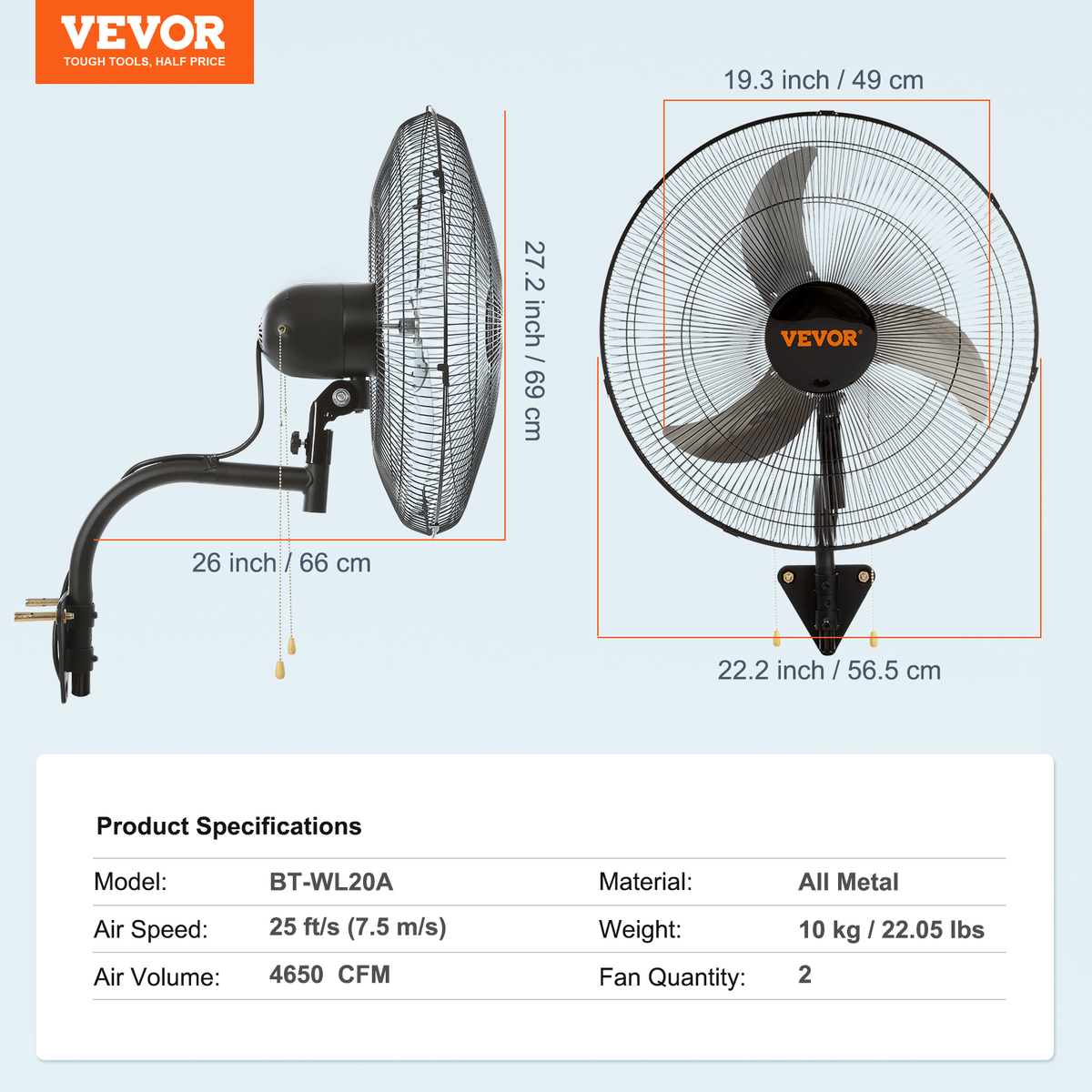 - VEVOR Wall Mount Fan, 2 PCS 20", 3-speed High Velocity Max. 4000 CFM, Black