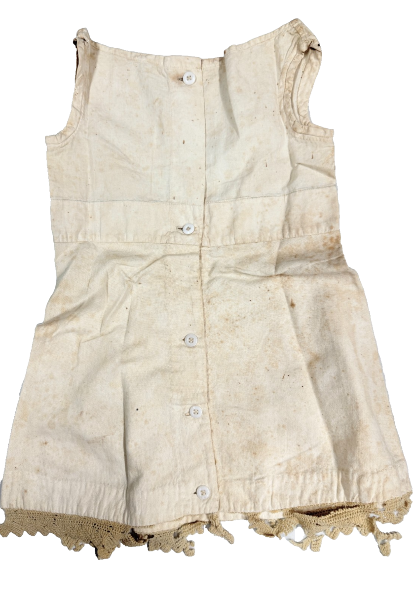 A rare and beautifully preserved Edwardian / WWI?era child?s chemise or slip, circa 1900?1918. Made of sturdy, rough-woven muslin cotton,and hand sewn seams, it closes in the front with sweet white glass buttons and features delicate hand-tatted lace trim at the hem ? what remains of it still speaks to the fine handiwork of the period. Its petite proportions and authentic attic-find patina make it not only a charming children?s garment, but also a perfect piece for doll costuming or display.