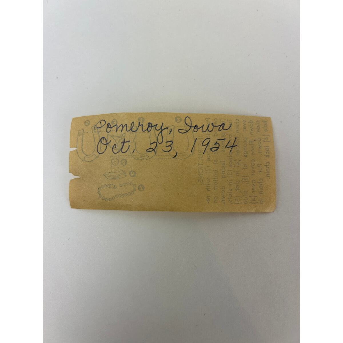 Vintage 1950s Good Luck Horseshoe puzzle key chain featuring a red horseshoe with a green horse insert, complete with original tan display card hand-dated ?Pomeroy, Iowa Oct. 23, 1954.? Printed assembly instructions on back. Original bead chain intact Card shows light edge wear and small corner crease Approx. 2.5? wide; card 3.25? tall Classic 1950s novelty good-luck toy with regional provenance