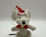 Primary image for Vintage 1970s Flocked Mouse Christmas Ornament Santa Hat Red Bow Bell