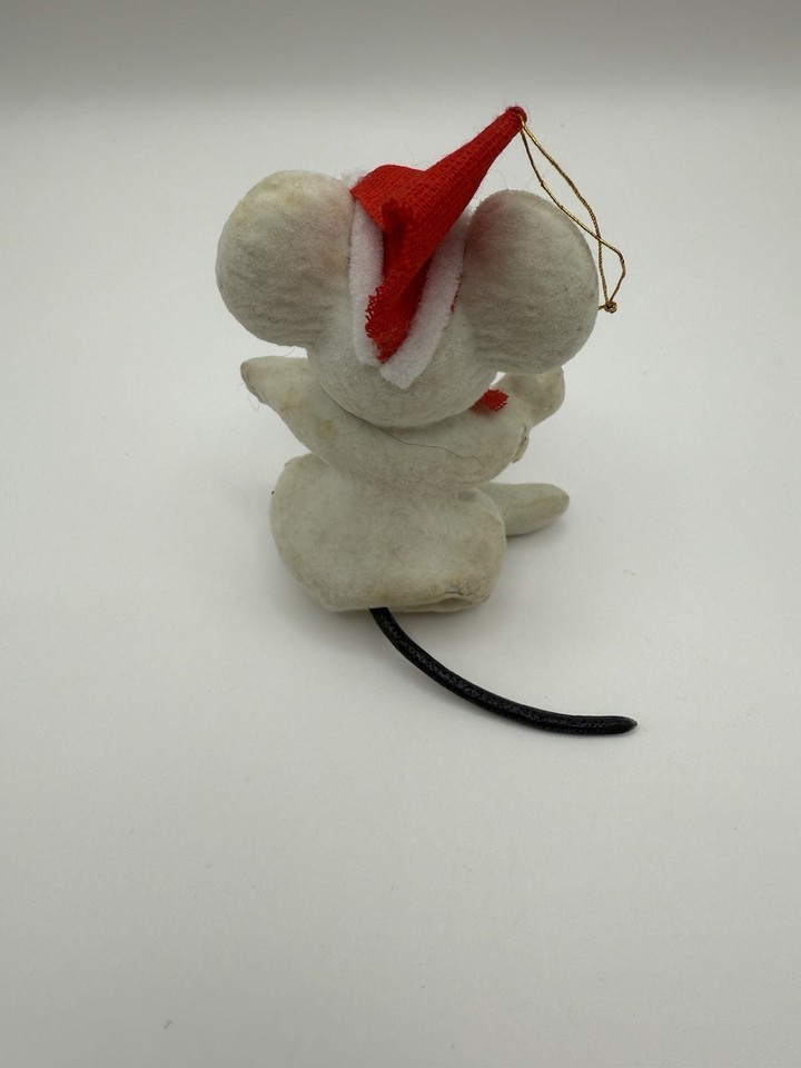 From a simpler, storybook Christmas past comes this vintage flocked mouse ornament, dressed in a Santa hat and tiny red bow with a golden bell. Standing just under 4 inches tall, this cheerful little mouse looks ready to help Santa deliver cheer on Christmas Eve. Made in the late 1960s?1970s, ornaments like this were often imported from Japan or Hong Kong and sold in five-and-dime stores?today they?re cherished for their whimsical charm and nostalgic texture. The soft flocked finish, felt hat, and wired tail make it a darling addition to any retro holiday collection. Details: ? Era: circa 1970s ? Material: flocked plastic with felt, fabric, and wire details ? Height: approx. 3.75? ? Features: Santa hat, red bow with gold bell, gold hanging cord ? Condition: good vintage condition with mild age wear and light spotting; intact tail and hanger. Please see photos for detailed views and dimensions. ? A perfect touch of nostalgia for your vintage tree, mid-century display, or cozy holiday vignette