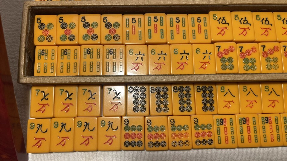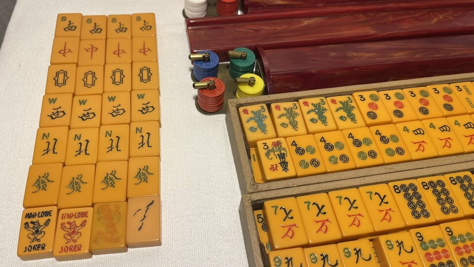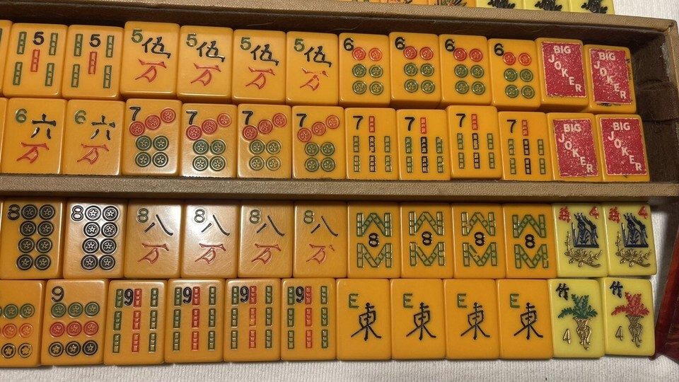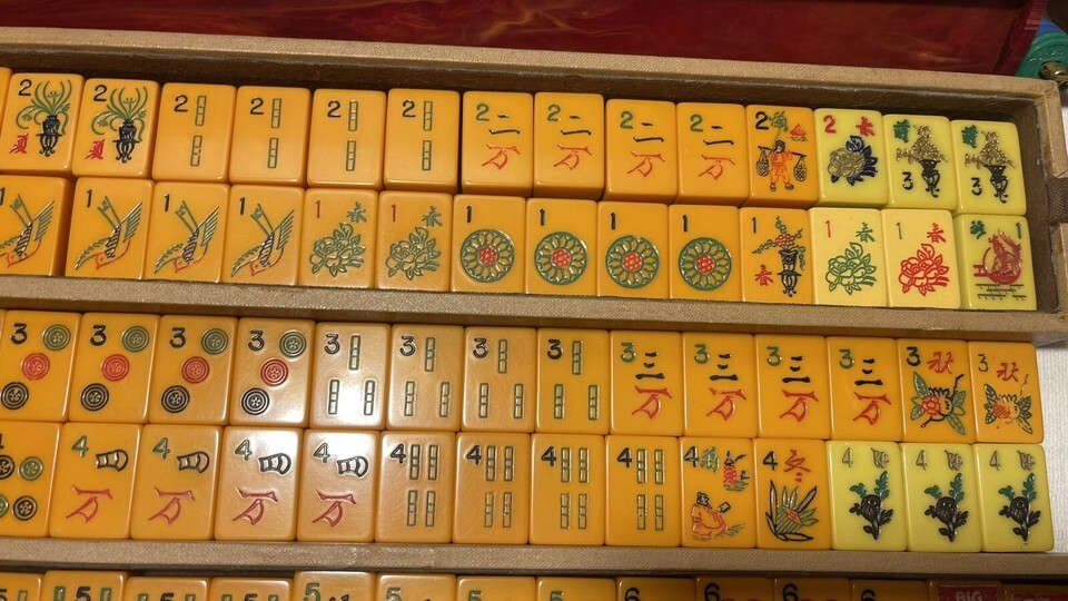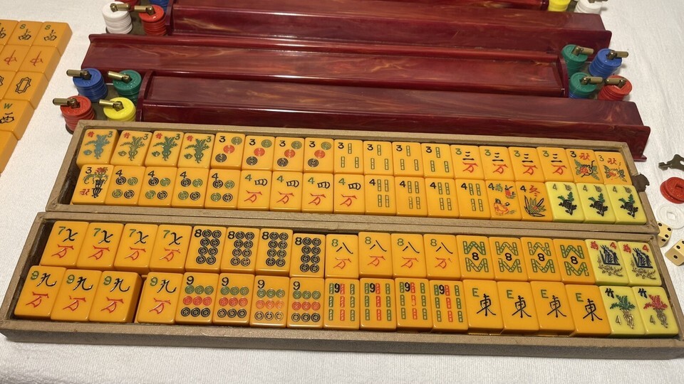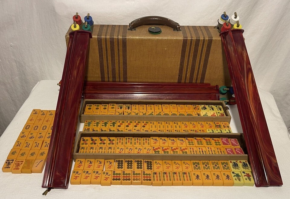 Vintage Bakelite and Mahjong set includes 175 tiles and 4 racks. The tiles are made of Bakelite, a type of early plastic, and feature traditional Mahjong designs. The set also comes with 4 racks for organizing and displaying the tiles during gameplay. A perfect addition to any vintage game collection for enthusiasts of traditional Mahjong.
