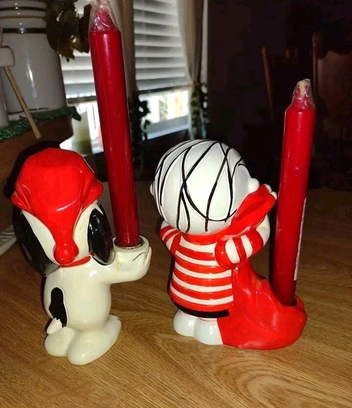 The Vintage Hallmark Snoopy Linus Peanuts Candle Holders stand at 8" tall and are made of ceramic. Featuring the beloved characters Snoopy and Charlie Brown from the Peanuts franchise, these candle holders come in white, red, and black colors.