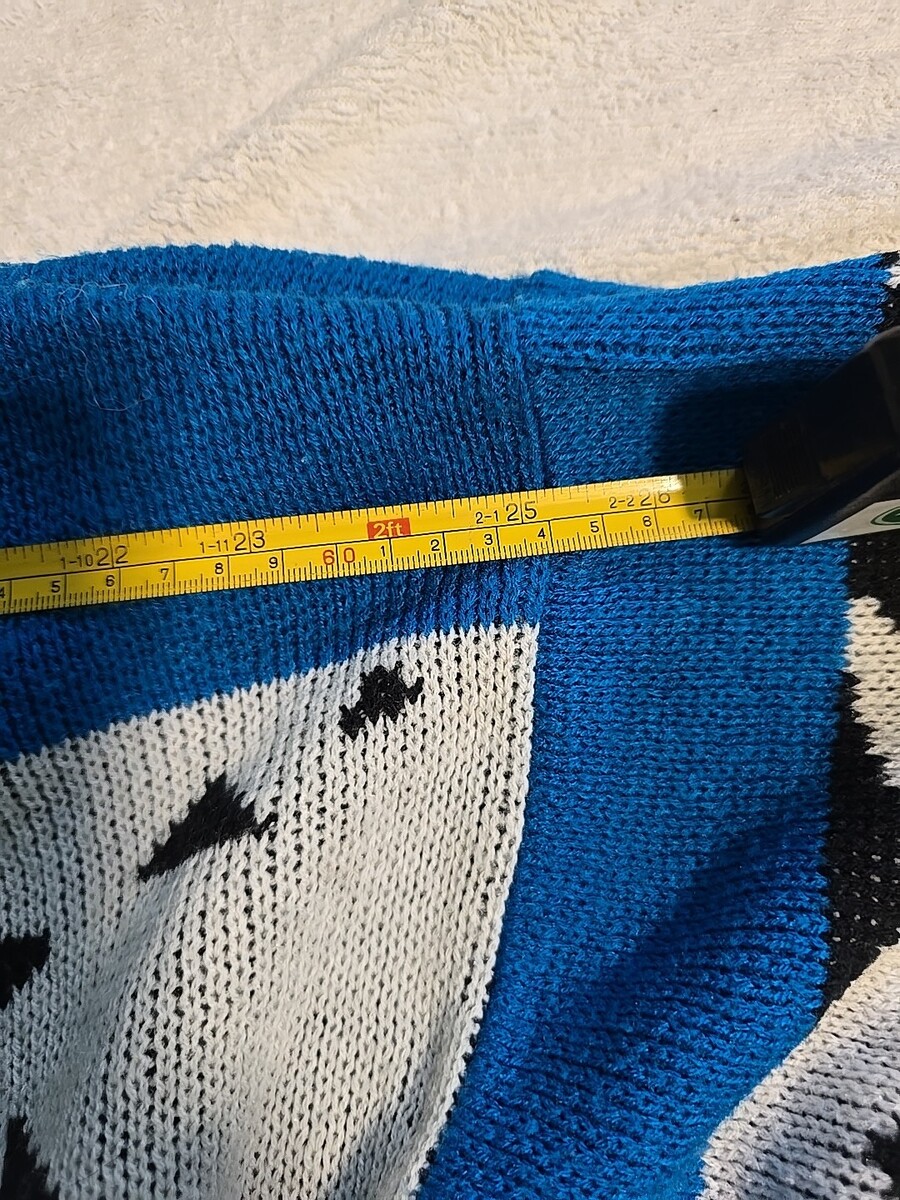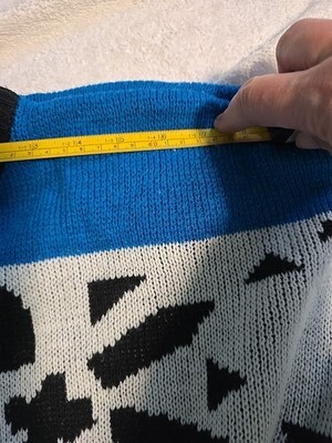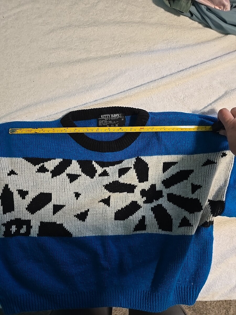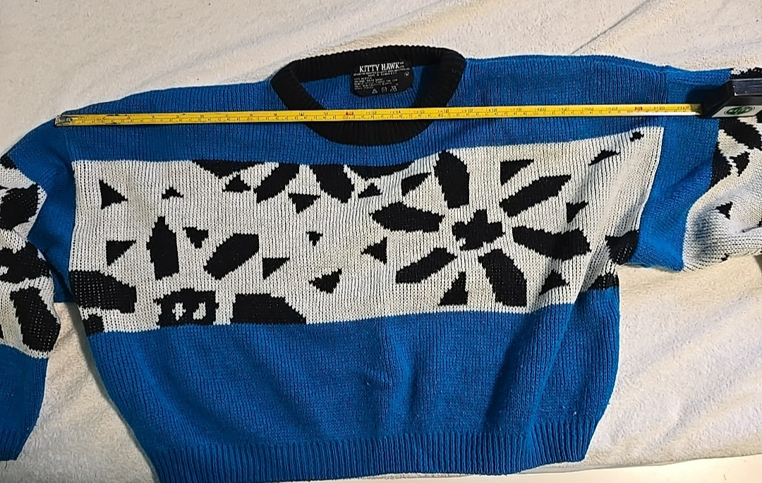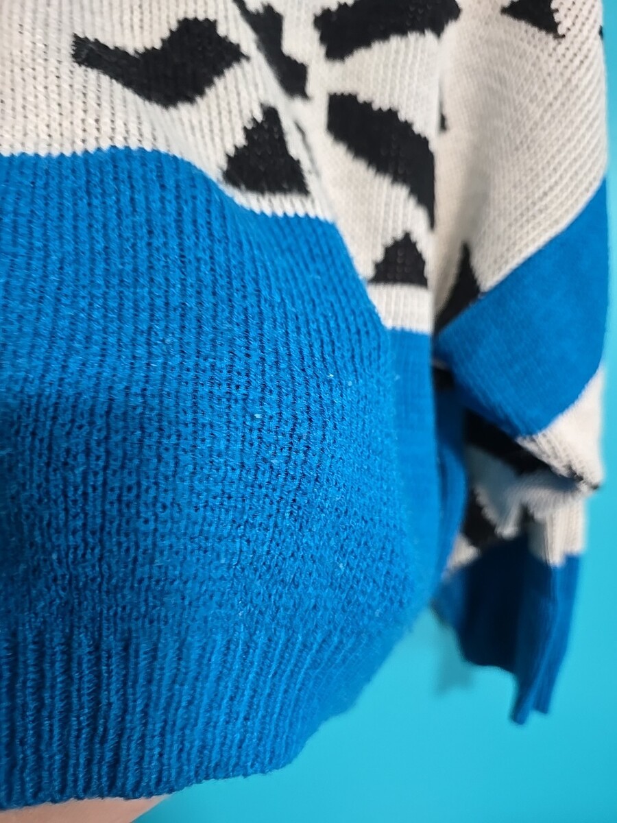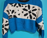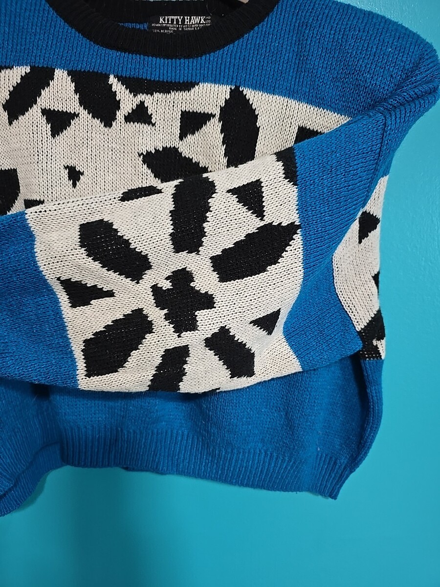- Vtg Kitty Hawk Medium Crop Top Knit Sweater Shoulder Pads Geometric Teal Floral