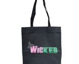 Black canvas tote bag with ?Wicked? in bright pink green lettering + witch hat accent.