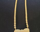 This necklace features a carved ribbed heart shaped cream celluloid pendant with round ivory beads. The vintage piece exudes a classic and elegant style, perfect for adding a touch of sophistication to any outfit. The cream color and intricate design make it a timeless and versatile accessory that can be worn for various occasions. SEE PHOTOS
